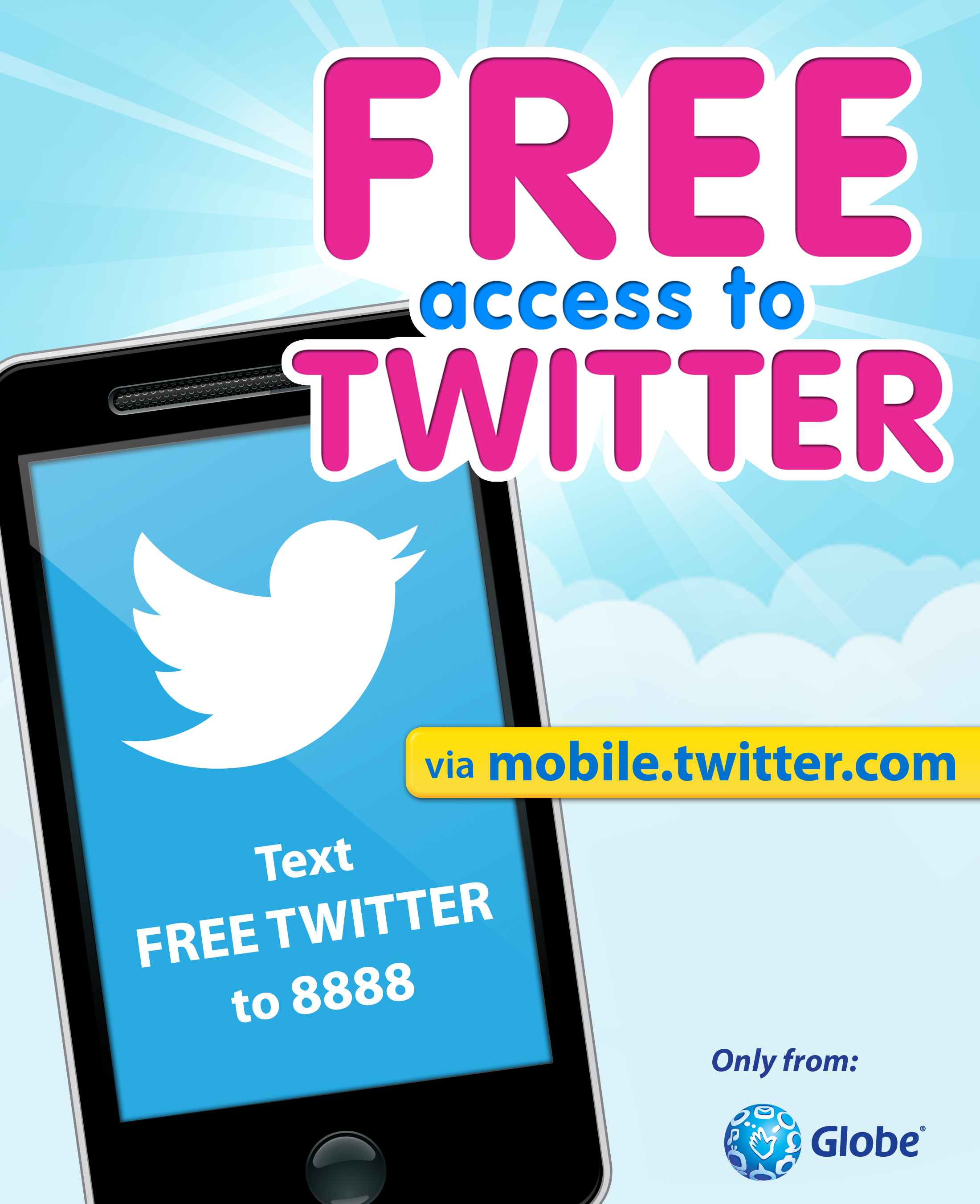 Access the Globe Free Twitter promo via mobile.twitter.com, the mobile version of www.twitter.com and enjoy posting tweets, shouting out re-tweets, and following friends at the comfort of your mobile phone at no cost. Simply register by texting FREE TWITTER to 8888 for free**.